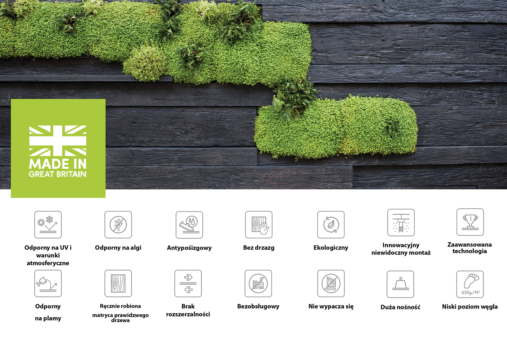 - Innowacyjny skład – deska nie zawiera drewna, co oznacza, że nie porasta mchem, nie gnije i nie butwieje, nawet w ekstremalnych warunkach atmosferycznych.